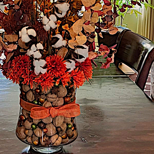 DIY autumn centerpiece idea with walnuts, acorns, branches, and fall leaves.