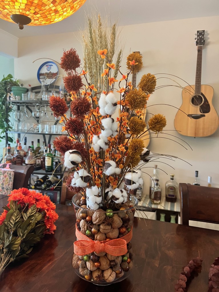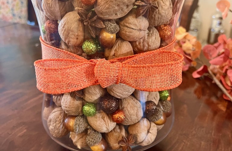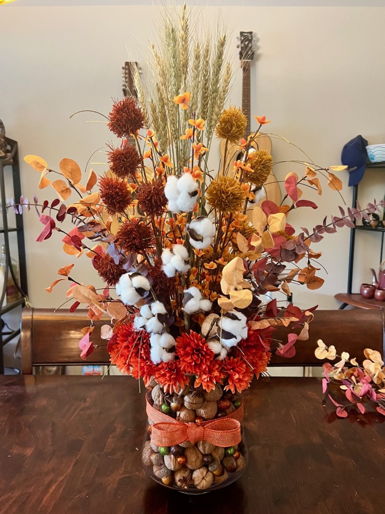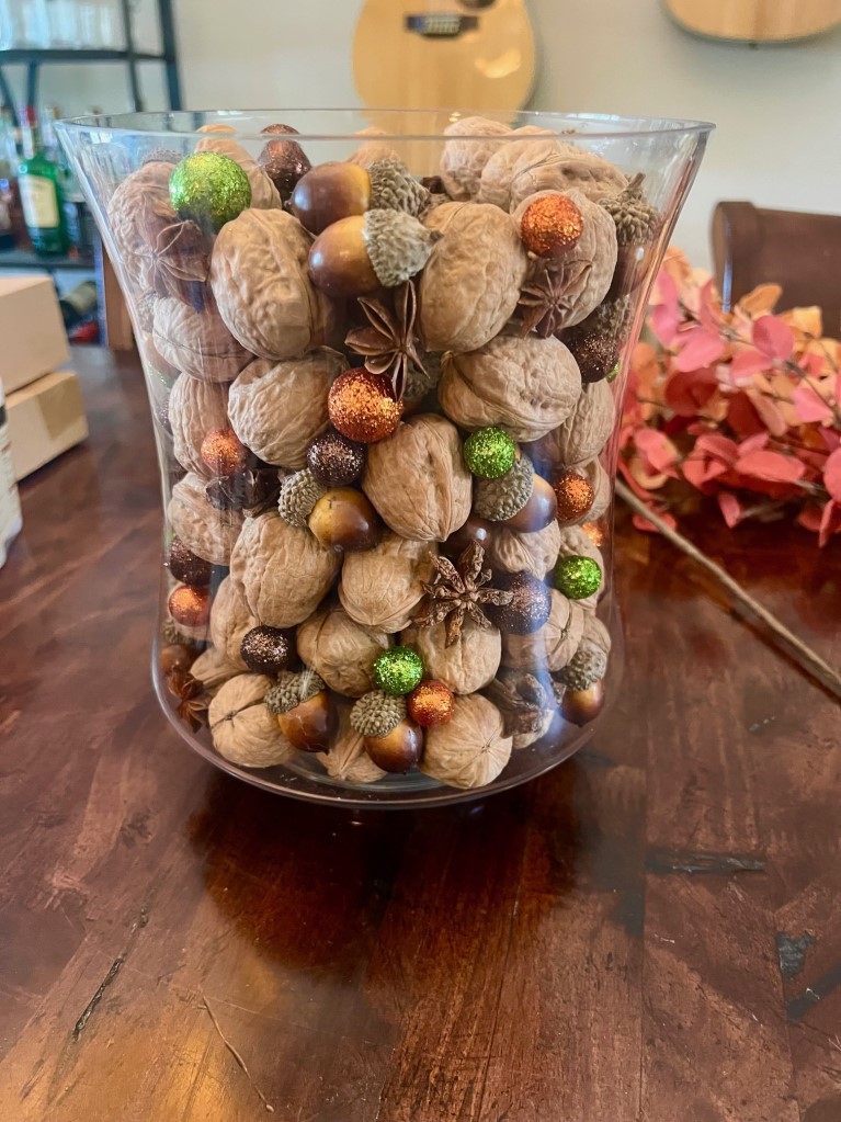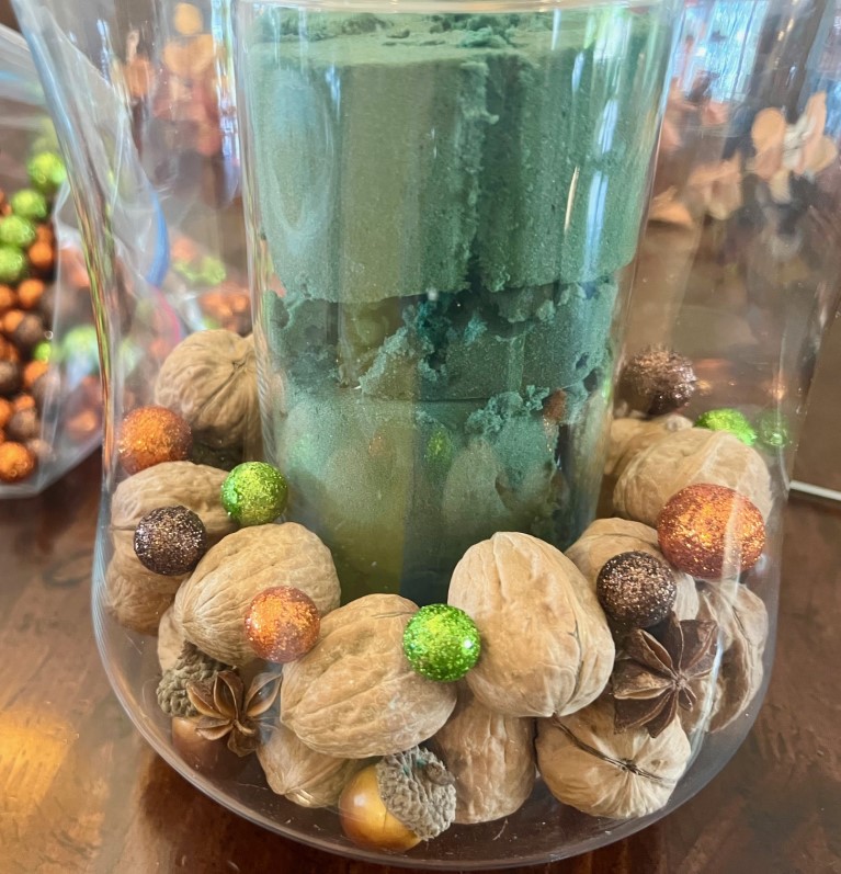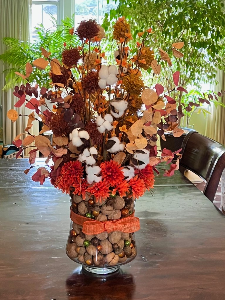 Fall makes me think of nuts and acorns, so I ordered what I thought would fill the vase nicely — then added a few Fall grasses, plumes, and colored leaves to the mix.