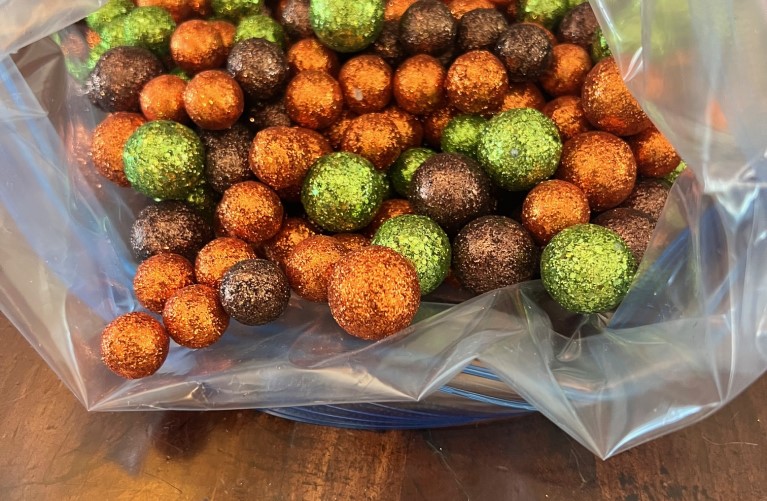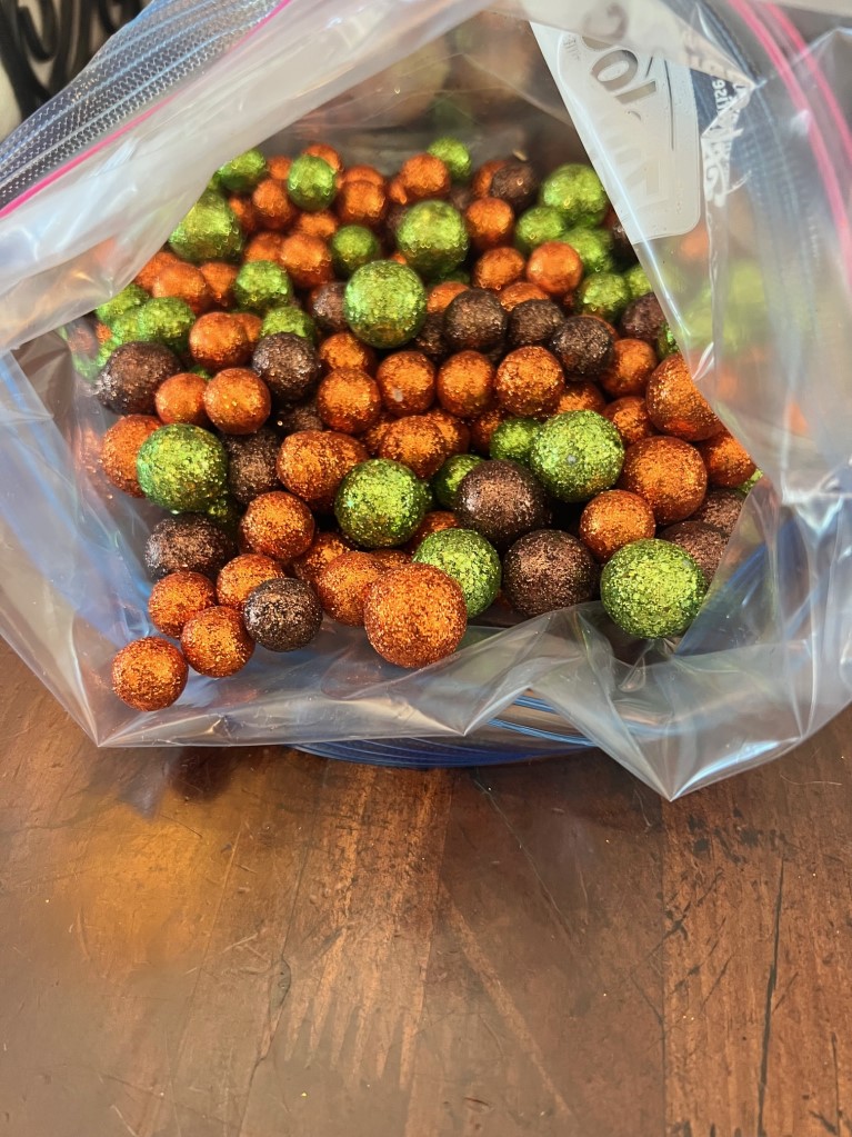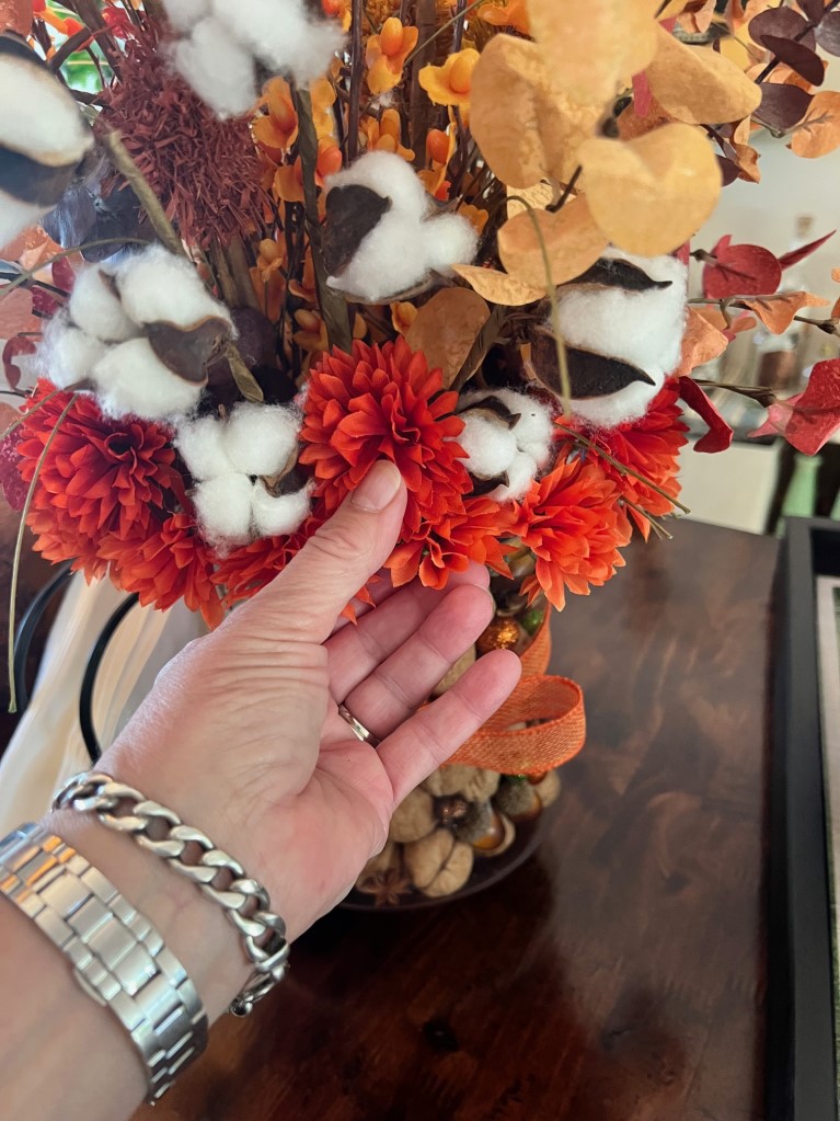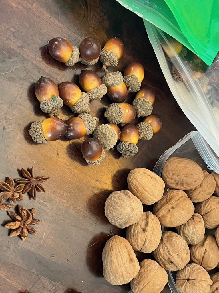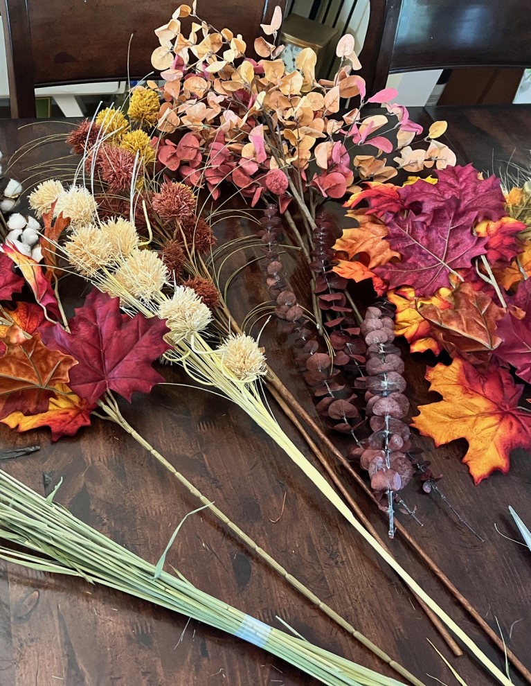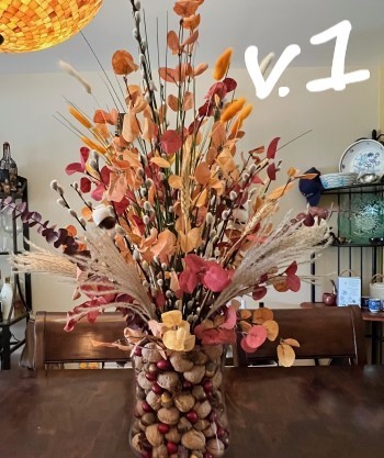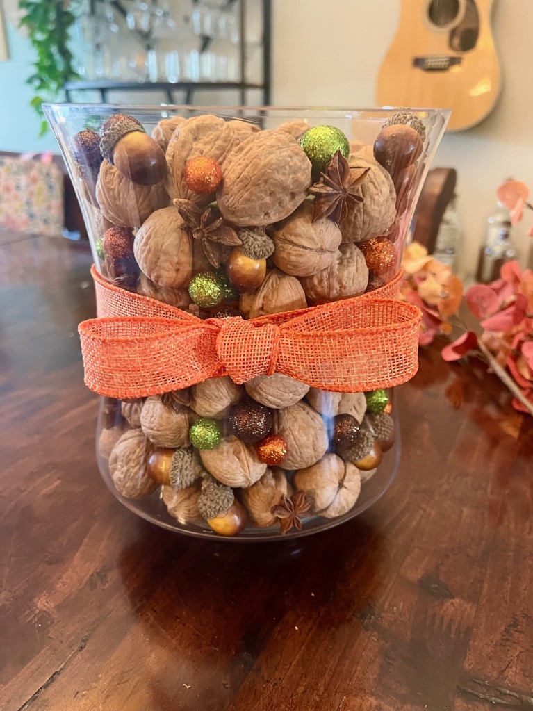 Fall makes me think of nuts and acorns, so I ordered what I thought would fill the vase nicely — then added a few Fall grasses, plumes, and colored leaves to the mix.