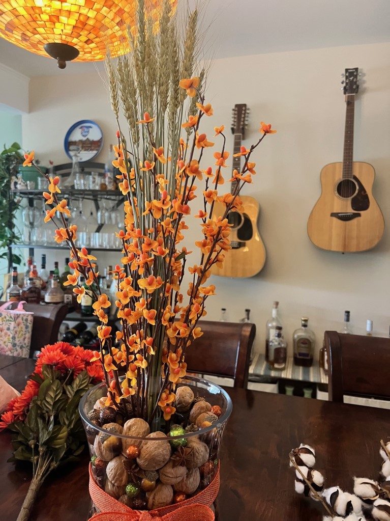 My first attempt was… well, let’s just say underwhelming. The spray of branches had the height I wanted, but everything felt muted, with no real pop. Even the vase with walnuts, acorns and cranberries looked dull. Truth is, I don’t always get it right on the first try.