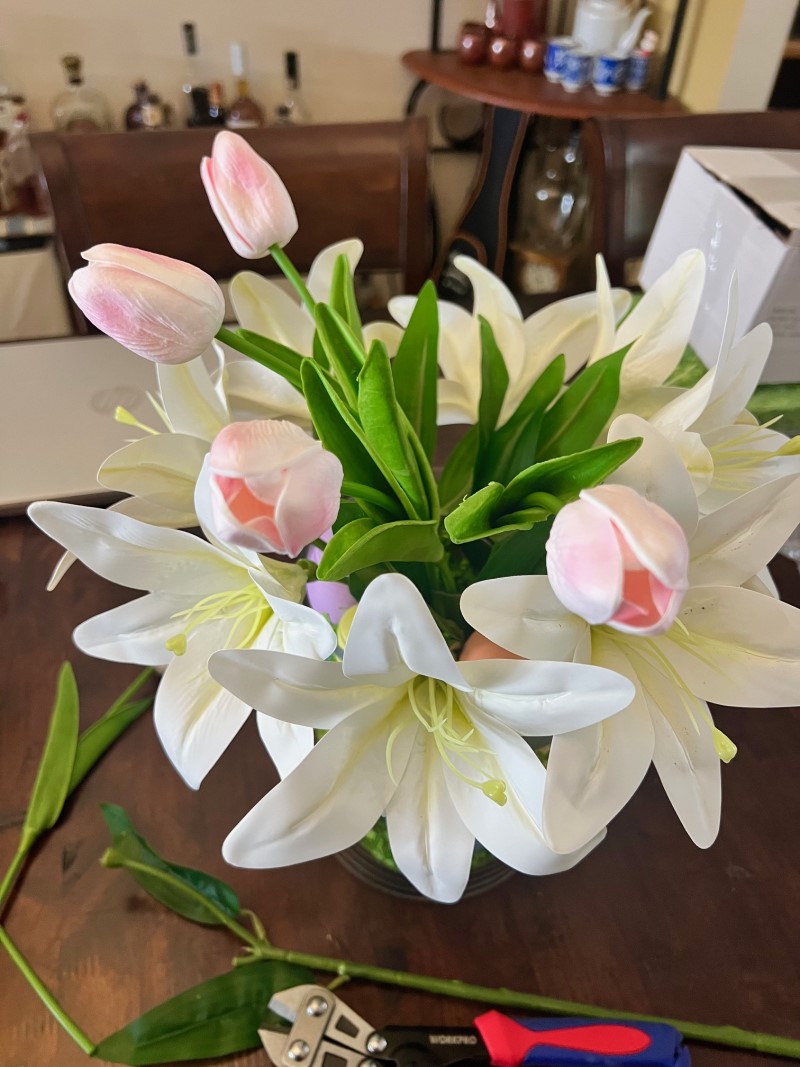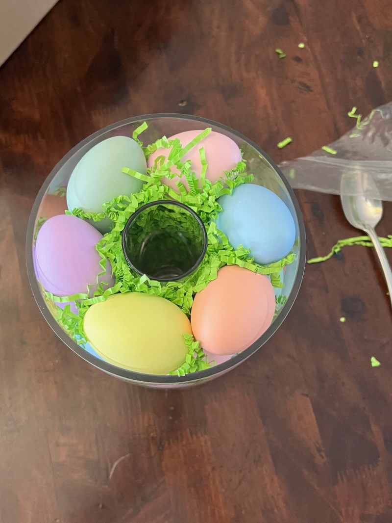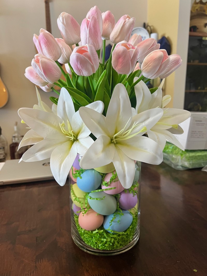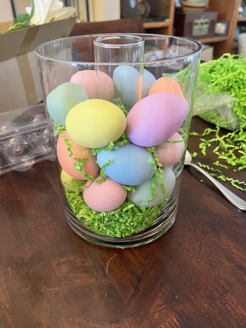 My Easter centerpiece is an easy DIY decoration made with pastel-colored eggs, bright greenery, and faux flowers arranged to create a natural-looking spring display. I put it together in just a few steps and it looks right at home on my holiday table.